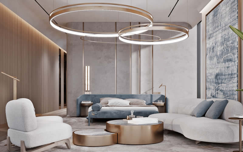 Each residence showcases modern architecture, skillfully crafted to maximize natural light through floor-to-ceiling windows, skylights, and lofty spaces, evoking a sense of serenity and ease. The design also features nature-inspired elements such as trees and verdant greenery intertwined with the buildings, adding a touch of tranquility.